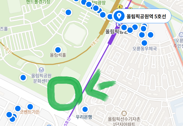 5호선 올림픽 공원역 3번 출구에서 나와서 앞으로 쭉 직진하면 장미 축제가 아래 초록색 동그라미 부분에서 장미 축제가 진행되는 것을 볼 수 있습니다.