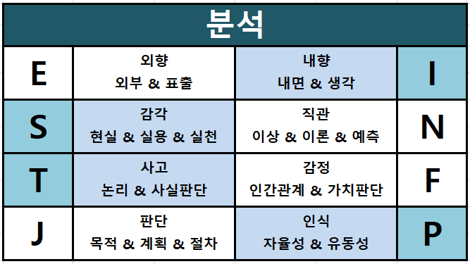 S : 감각적이고 현실적으로 발달된 유형입니다. 실용적인 가치에 우선하며 실천을 우선시하는 성실한 편입니다.