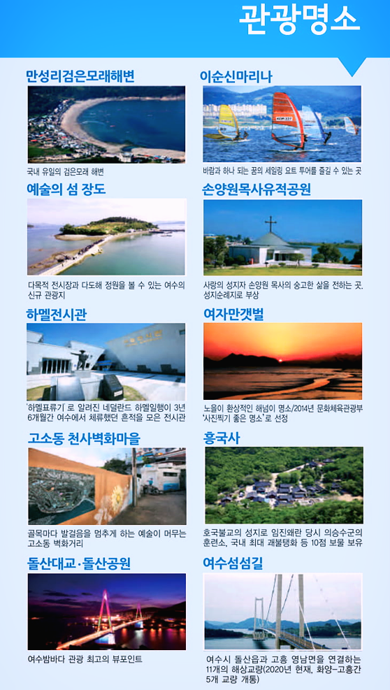 오동도 , 거문도, 향일암, 금오도 비렁길, 여수세계박람회장, 진남관, 여수밤바다로 유명한 산단야경, 영취산 진달래, 여수해상케이블카, 여수이순신대교