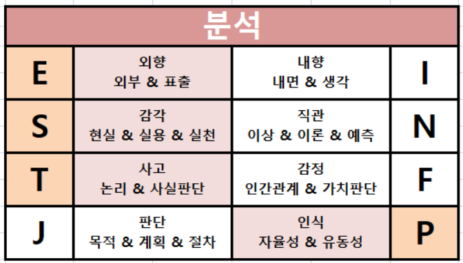 16개의 MBTI 유형은 사회학 모델로 나눠보면 총 4개의 유형으로 나눠지게 됩니다.