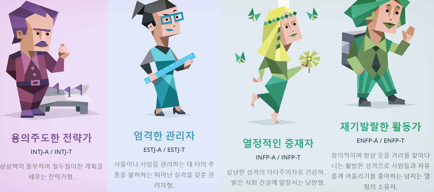 16개의 MBTI 유형은 사회학 모델로 나눠보면 총 4개의 유형으로 나눠지게 됩니다.