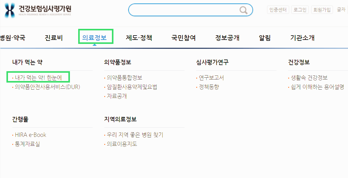 그런 뒤에 의료정보 -> 내가 먹는 약! 한눈에 를 클릭해줍니다