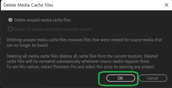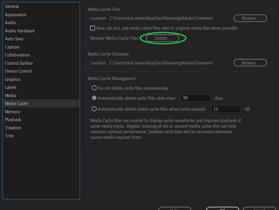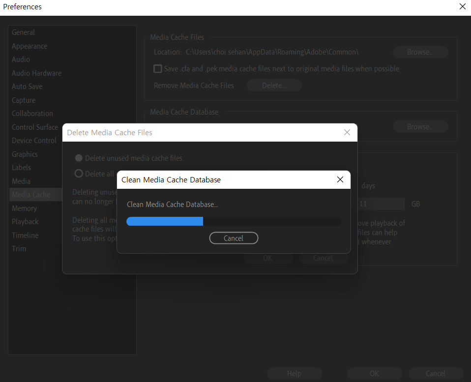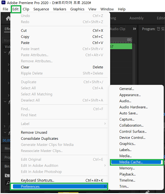 프리미어 프로 미디어 캐쉬 지우는 방법