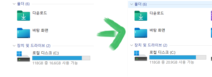 이렇게 미디어 캐시를 지워주고 나니 아래와 같이 제 C드라이브 용량이 변화되었습니다