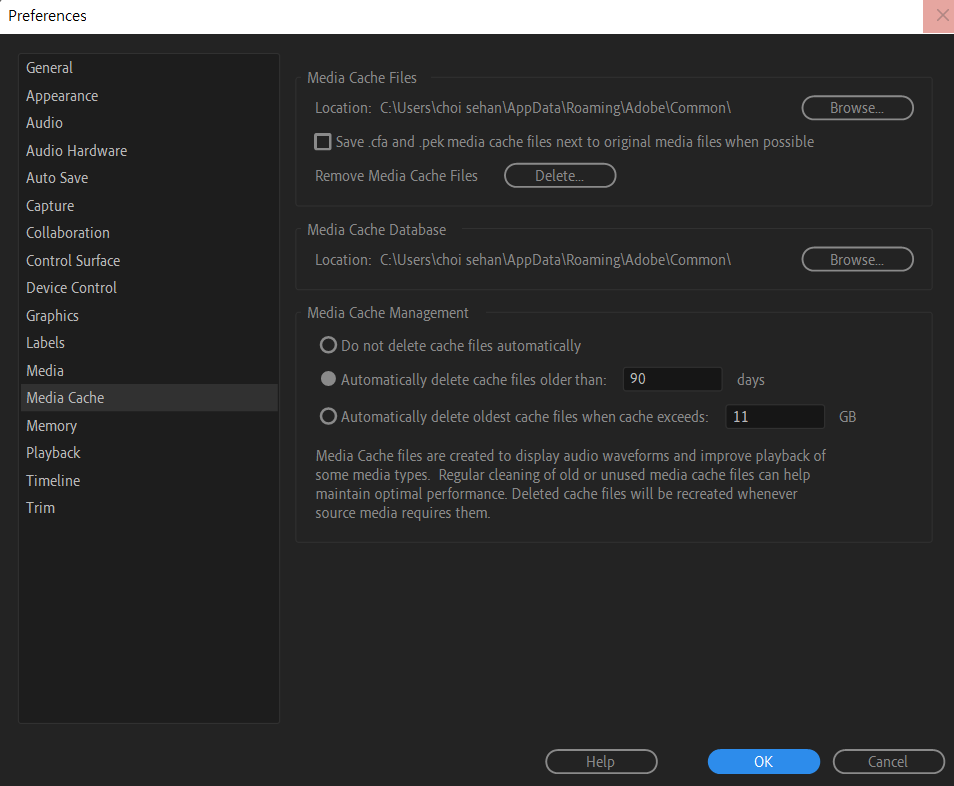프리미어 프로 미디어 캐쉬란,