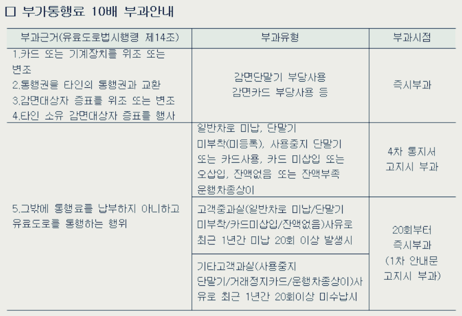 기존 통행료의 10배의 금액을 지불해야 하는 경우가 발생할 수 있습니다.