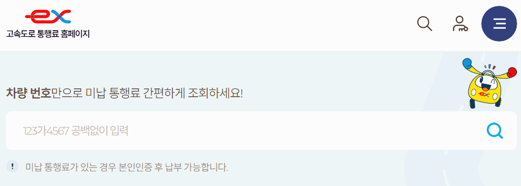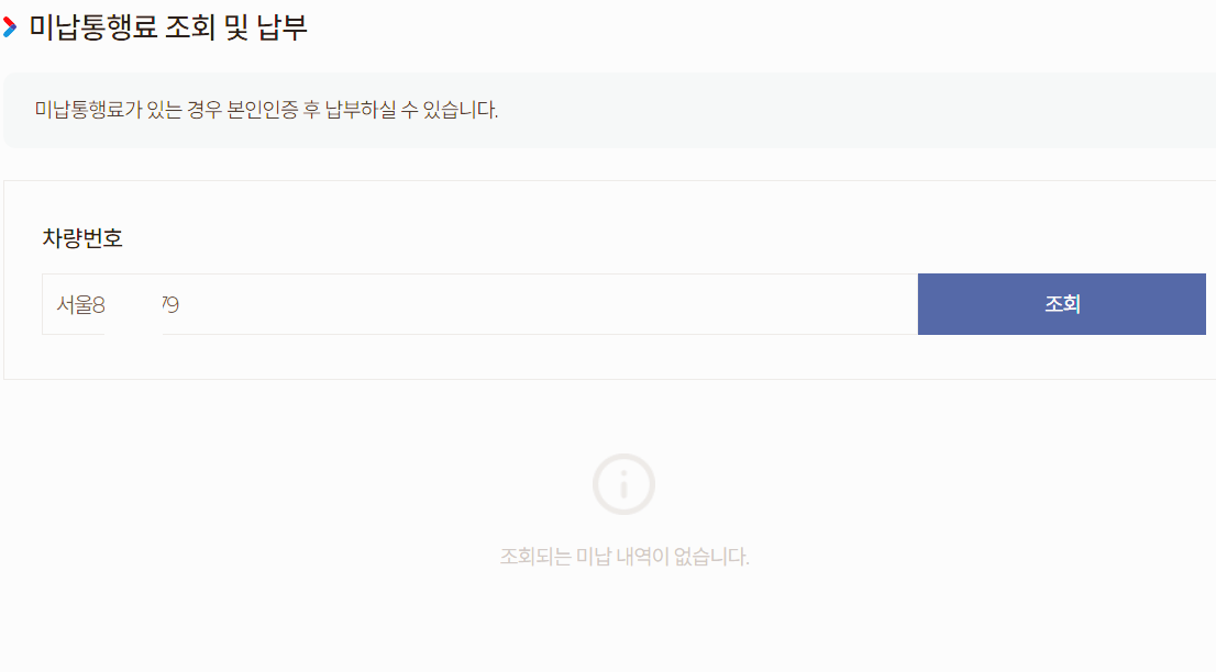 따로 가입할 필요도, 인증할 필요도 없이 바로 차량번호만 입력하면 아래와 같이 미납 요금이 있는지, 혹은 미납 요금이 없는지 확인이 가능합니다.