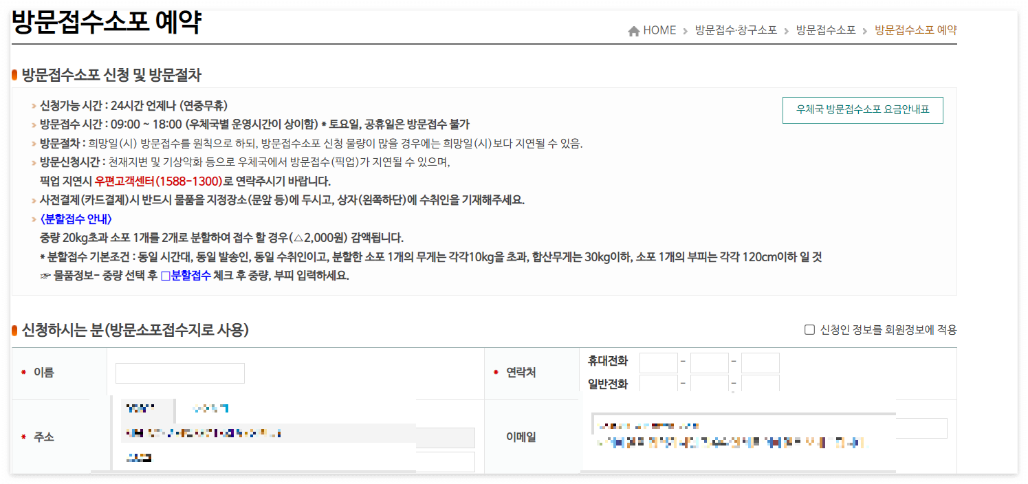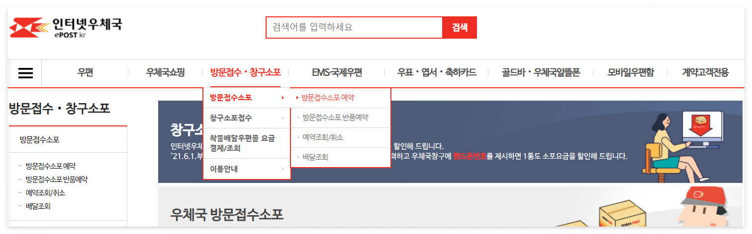 방문접수 * 창구소포 -> 방문접수소포 -> 방문접수소포 예약