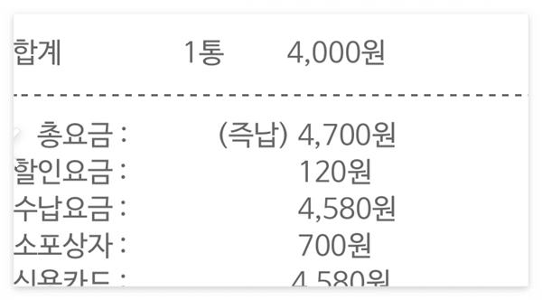 그리고 소포 상자중에서 가장 작은 1호 사이즈를 구매했는데, 상자값이 700원입니다