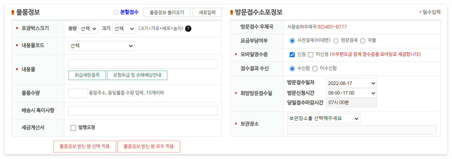 방문접수 * 창구소포 -> 방문접수소포 -> 방문접수소포 예약