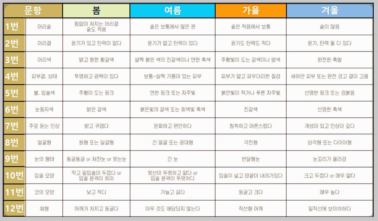 그렇게 체크를 하신뒤에 가장 많이 선택이 된 부분이 바로 자신에게 맞는 4계절 퍼스널 컬러입니다.