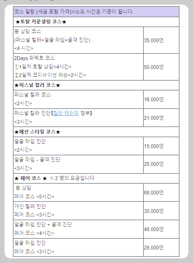 아래는 실제 일본에서 진행되는 퍼스널 컬러 진단 비용입니다