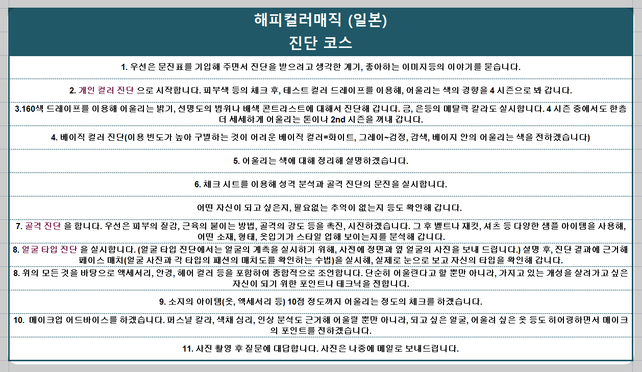 아래는 실제로 진행되는 퍼스널 컬러를 찾는 코스에 대한 내용인데 한국어로 번역을 해왔습니다.