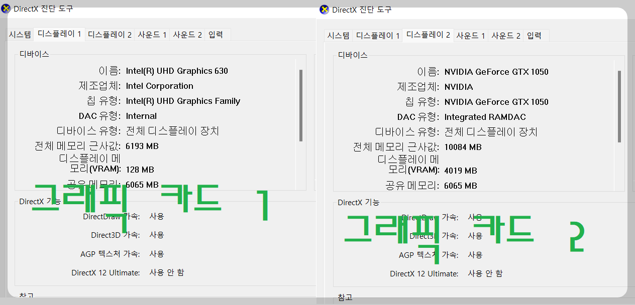 그리고 위에 디스플레이 1, 디스플레이 2의 경우 내 컴퓨터의 그래픽 카드 정보입니다.