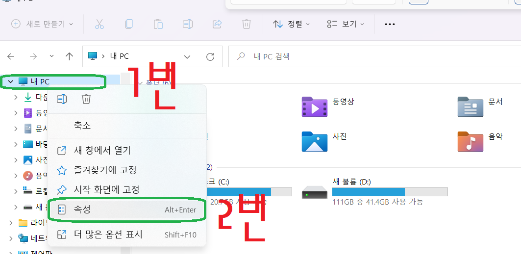 1. 아무 폴더나 연 다음 내 pc 속성 보기