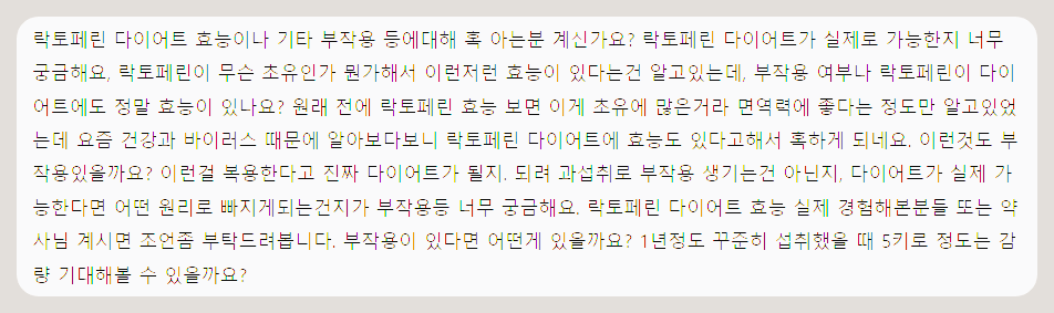 종합적인 의견을 살펴보면 어느정도 효능이 있긴 하지만 너무 맹신하고 락토페린을 먹는 것 만으로는 큰 다이어트 효과를 기대하긴 어렵다 였습니다.
