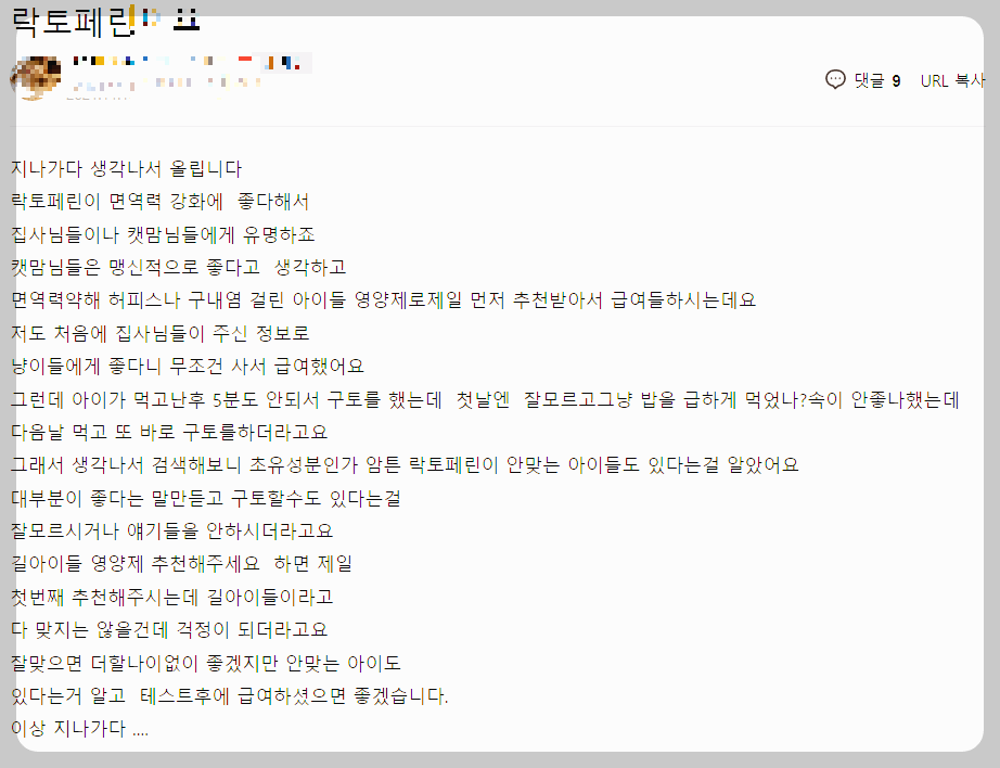 락토페린 효능 체크 - 맘 카페 & 캣 카페 후기들 참고