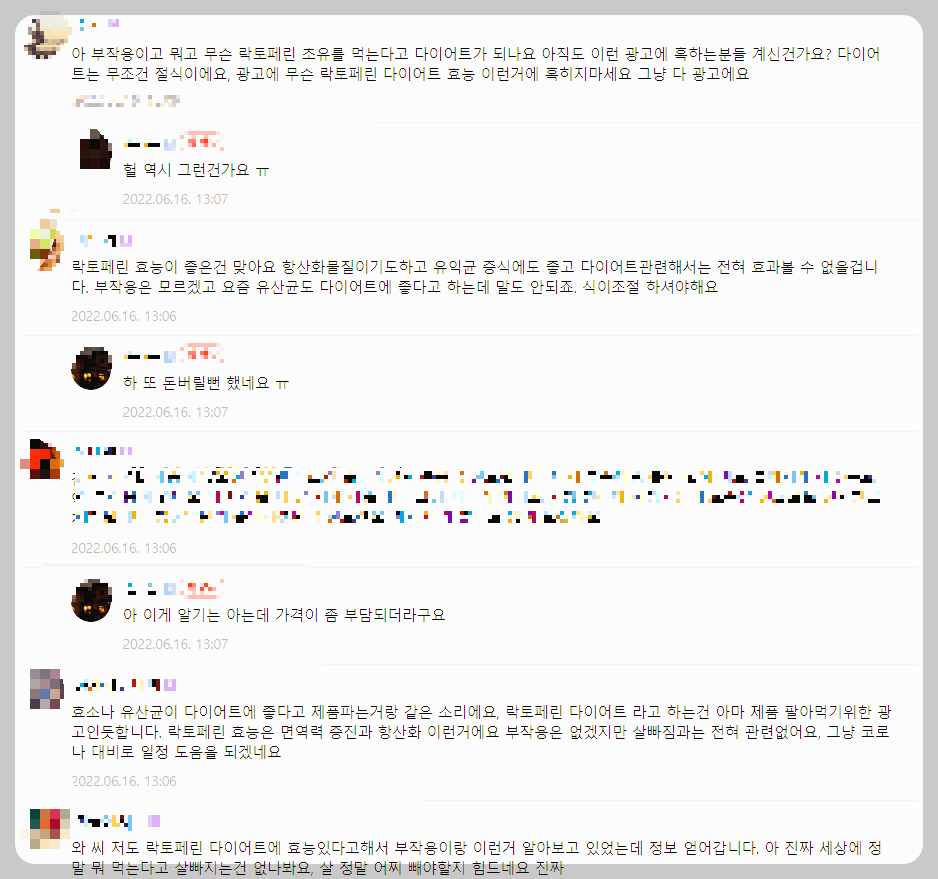 종합적인 의견을 살펴보면 어느정도 효능이 있긴 하지만 너무 맹신하고 락토페린을 먹는 것 만으로는 큰 다이어트 효과를 기대하긴 어렵다 였습니다.