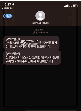 그리고 확인 버튼을 눌러주면 현재 세대주인 저의 누나에게 아래와 같이 문자가 보내집니다.