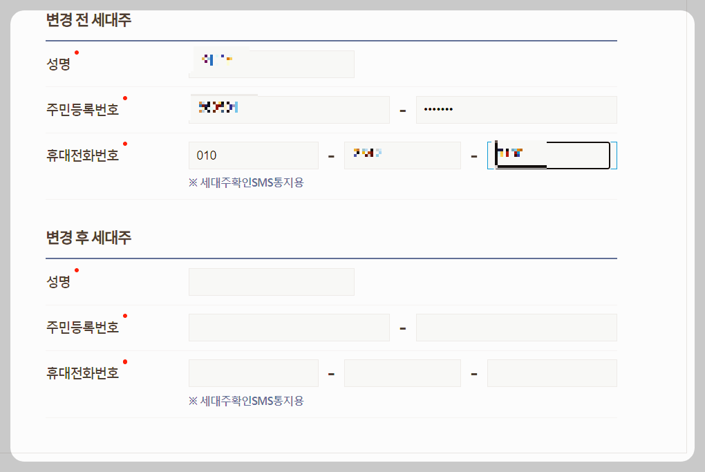 변경 후 세대주에는 저의 정보를 넣습니다.