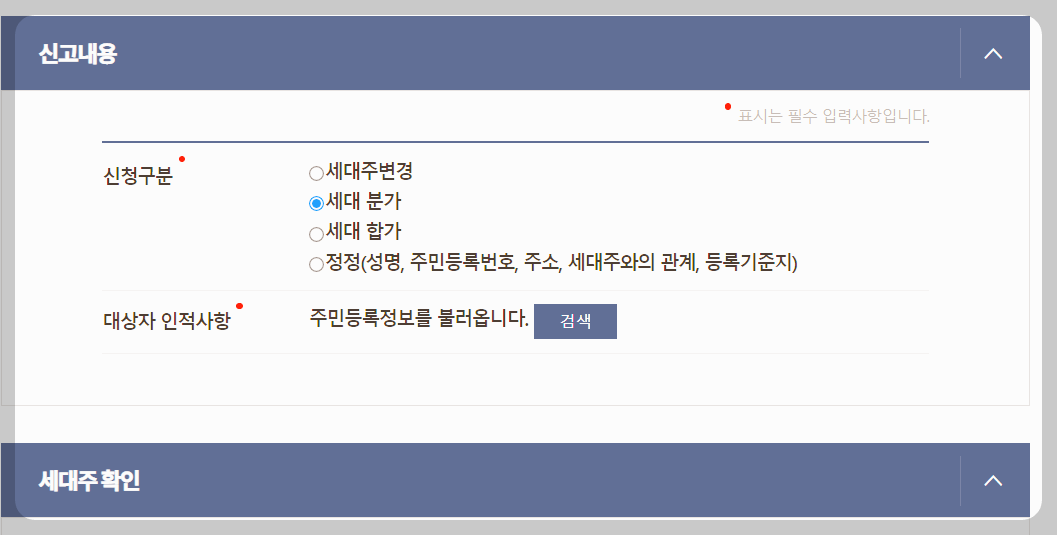 온라인으로 세대 분리를 신청 했습니다.