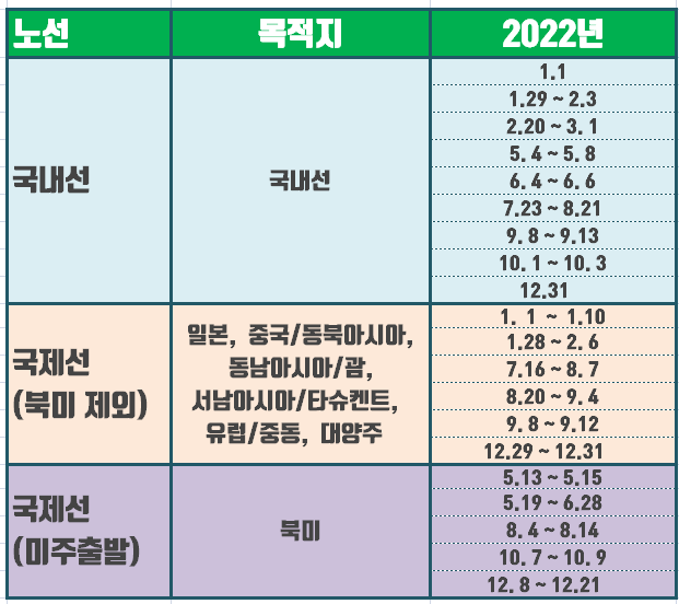 아래와 같이 비수기 시즌에 최대한 맞춰서 일정을 잡는게 좋겠습니다.