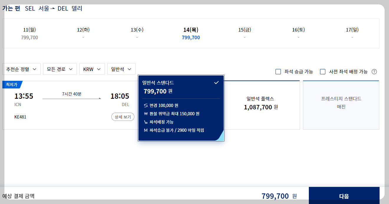 한가지 재밌는 점은 국내선 기준으로 (제주도) 비수기 시즌에는 일반이랑 프레스티지 비용 차이가 얼마 나지 않습니다
