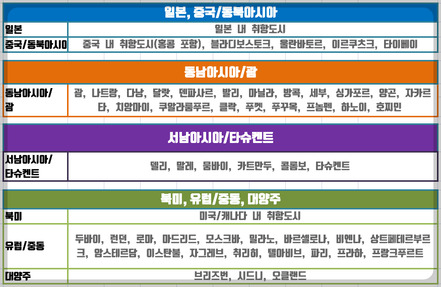저의 경우 인도의 델리로 갈 예정이기 때문에 찾아본 바, 델리는 서남아시아 / 타슈켄트 지역으로 확인이 되었습니다.