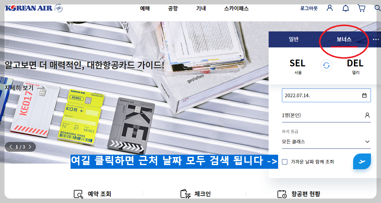 보너스를 먼저 선택하신 뒤에 가고자 하는 목적지와 날짜를 선택 후 조회를 하시면 마일리지로 아래와 같은 결과물이 나오게 됩니다.