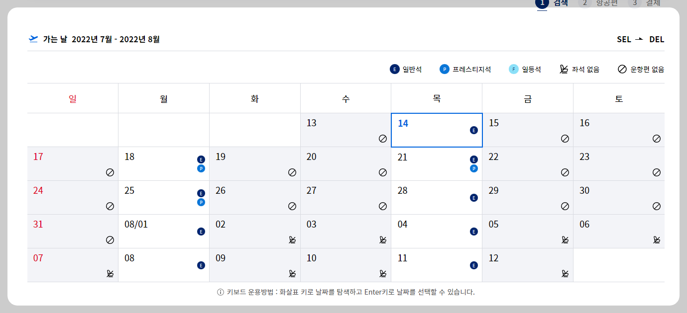 파란색 원으로 E(economy)는 일반석 / P(prestige) 프레스티지석으로 나눠지며 각 각 소모되는 마일리지 비용이 다릅니다