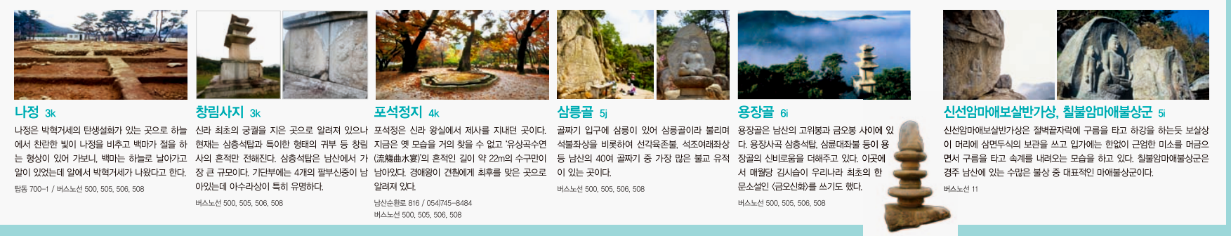 나정, 창림사지, 포석정지, 삼릉골, 용장골, 서출지, 통일전, 남산탑곡마애불상군, 신선암마이, 칠불암마애불상군 등의 다양한 불교 문화 석굴을 살펴볼 수 있습니다.