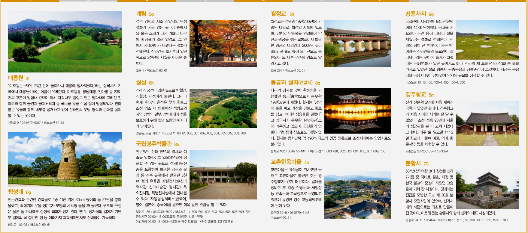 대릉원, 첨성대, 계림, 워성 국립경주박물관, 월정교, 동궁과 월지, 교촌한옥마을, 황룡사지, 경주향교, 분황사