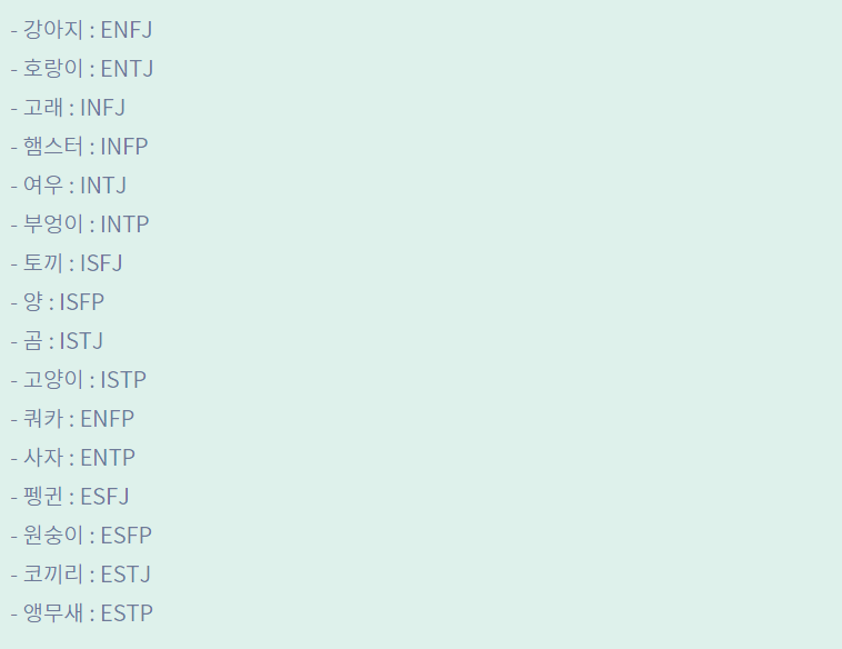 제가 좋아하는 동물로 알아보는 내 mbti 유형 검사입니다