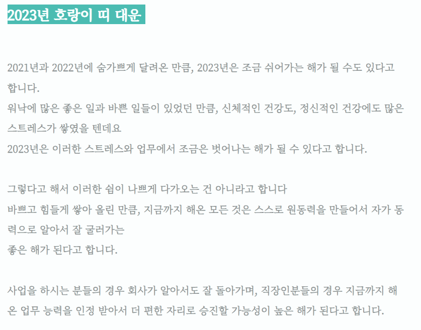 그 전에 앞서서 다가오는 계모년 2023년 호랑이 띠의 나이 별 운세는 어떻게 되는지 먼저 보고 가시겠습니다