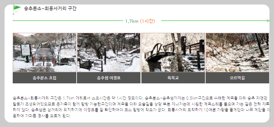 특징 : 숲의 향기를 느낄 수 있는 코스이며 계곡이 있는 흙길을 천천히 올라가기 좋은 코스입니다