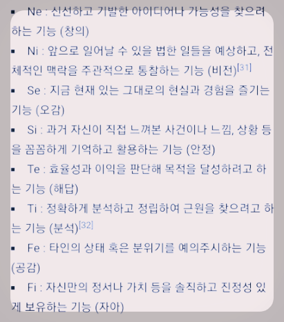 이와 반대되는 것은 F로 인간관계, 가치판단인데, 이러한 것 보다 저의 경우 논리성과 사실 판단에 더 중점을 두고 있다는 뜻이기도 합니다