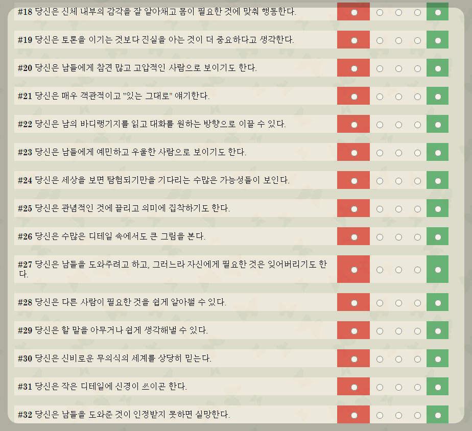 그런점에서 대중화된 엠비티아이 검사는 신뢰도가 많이 떨어지는 편이지만, 위에 사키노르바 테스트의 경우 대충 가볍게 선택을 해도 굉장히 넓은 범위에서 좁혀가기 때문에 내 성격과 100% 일치하는 유형의 엠비티아이를 고르게 됩니다