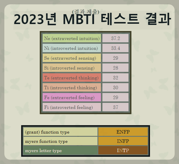 grant function type의 경우 내 속에 잠재된, 발현될 가능성이 높은 mbti이며 myers function type의 경우 나의 가장 강한 모습이 나타나는 유형 myer letter type은 이 모든걸 합친 최종 결과라고 보시면 되겠습니다 |