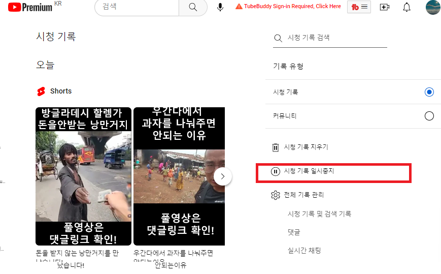 또 지금까지 내가 봤던 시청 기록들을 그냥 지워버리는게 아쉬울 수 있어서 유튜브에서 만들어둔 기능이 하나 더 있습니다