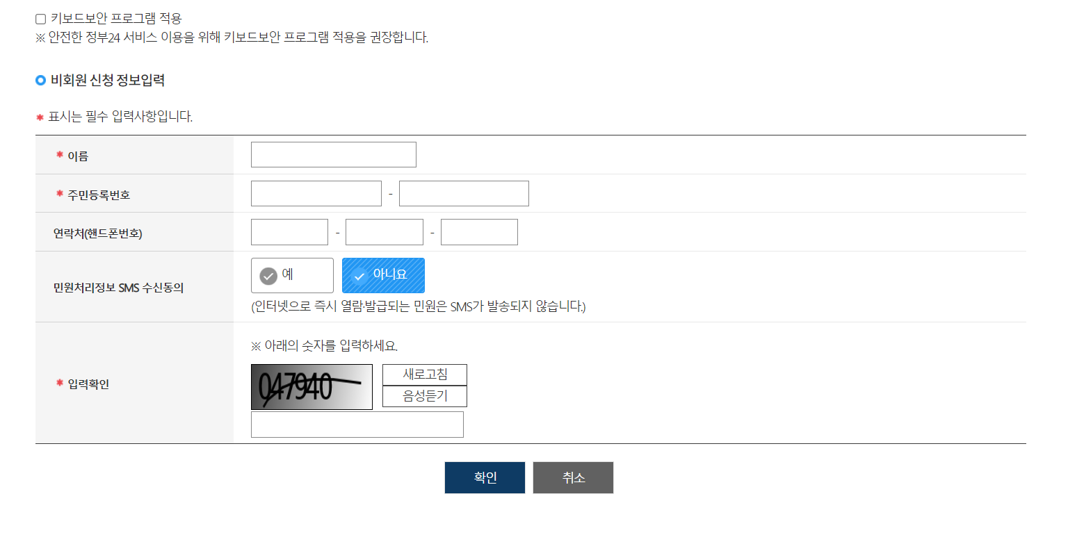 정부 24의 경우 상당히 많이 이용하는 정부 기관 포털이기 때문에 대부분 회원 등록이 되어있겠지만, 그래도 비회원으로 신청을 진행해보겠습니다