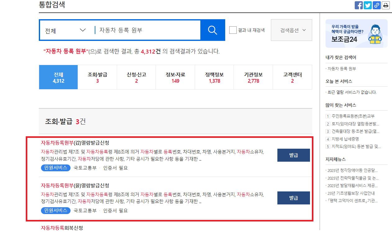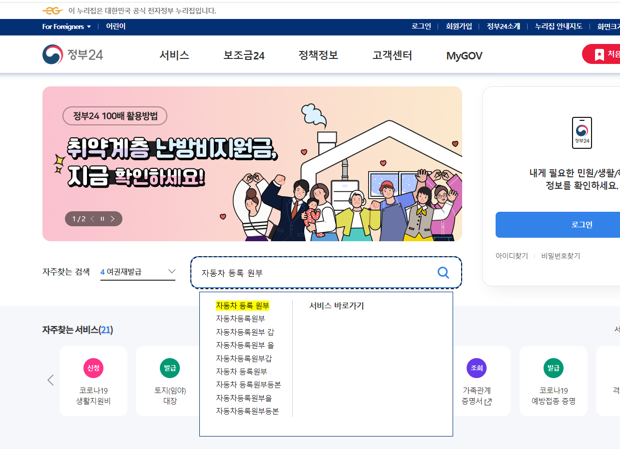정부 24에 들어가신 뒤에 자동차 등록 원부를 검색해줍니다