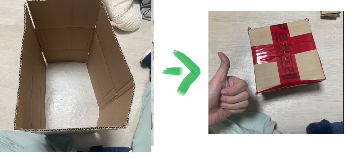 위 아래 날개 부분 같이 박스를 결합해주는 부분을 완벽하게 닫아야 박스가 밀봉이 됨으로