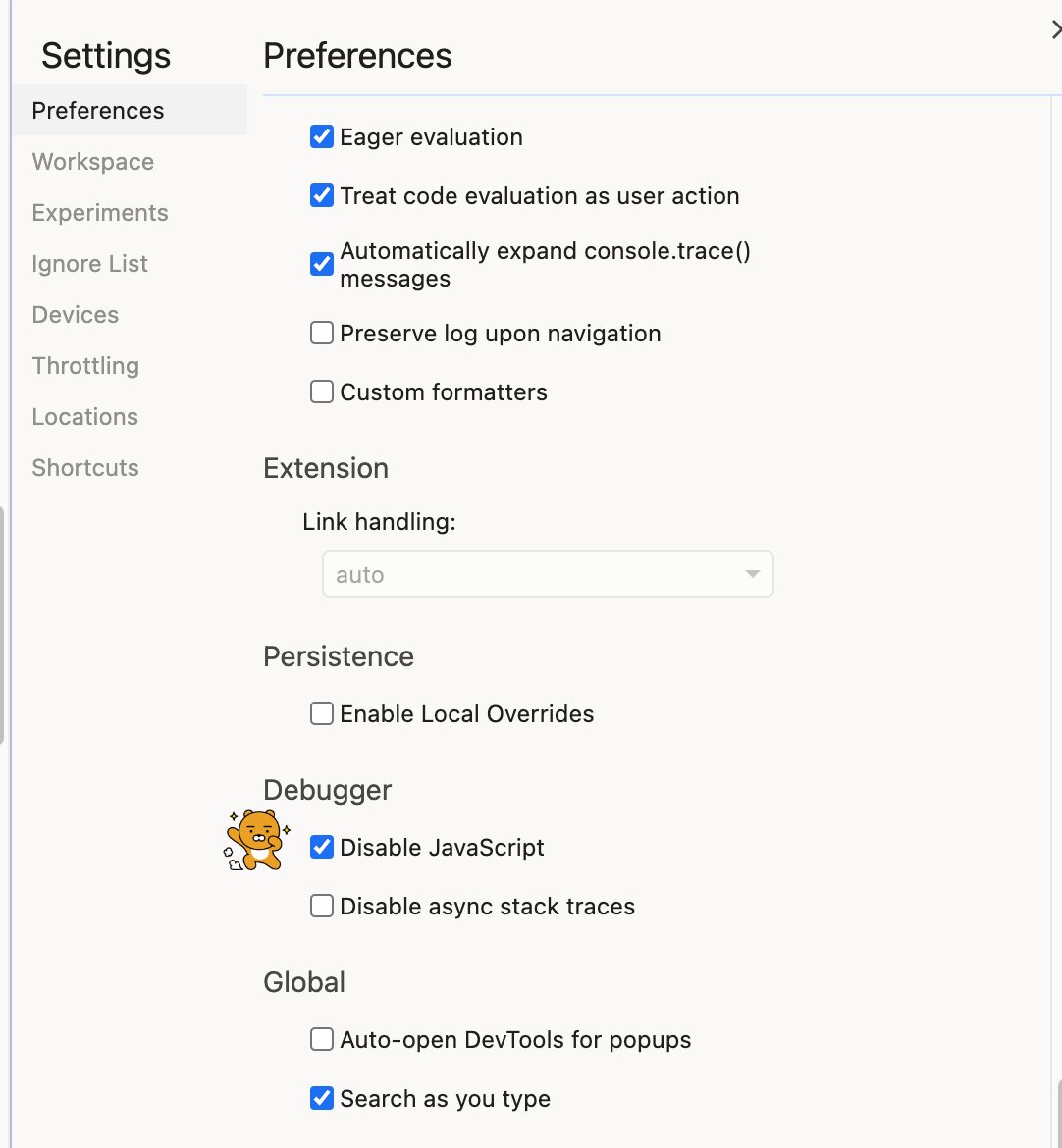 여기서 우리는 Disable Javascript를 선택해줍니다