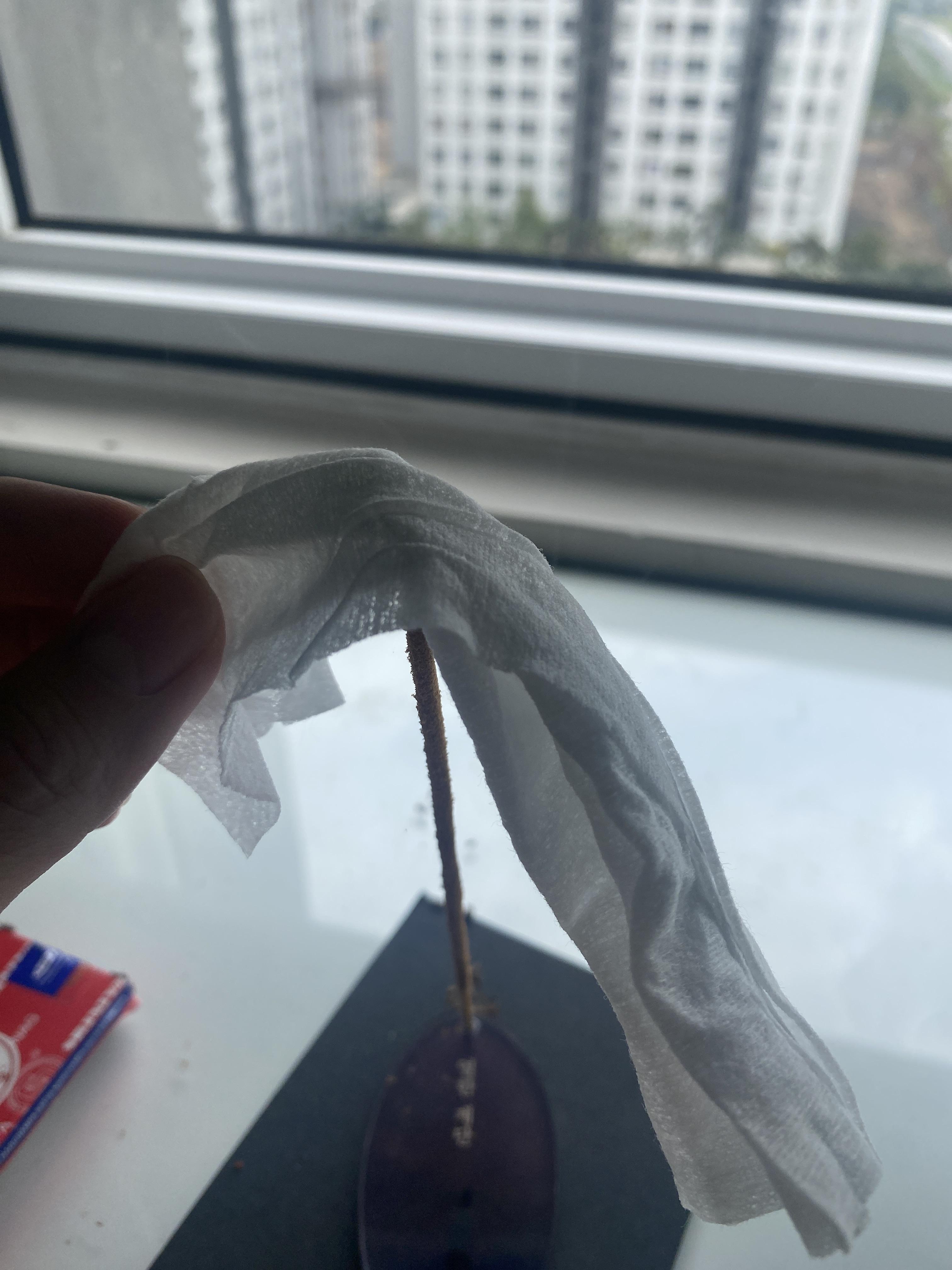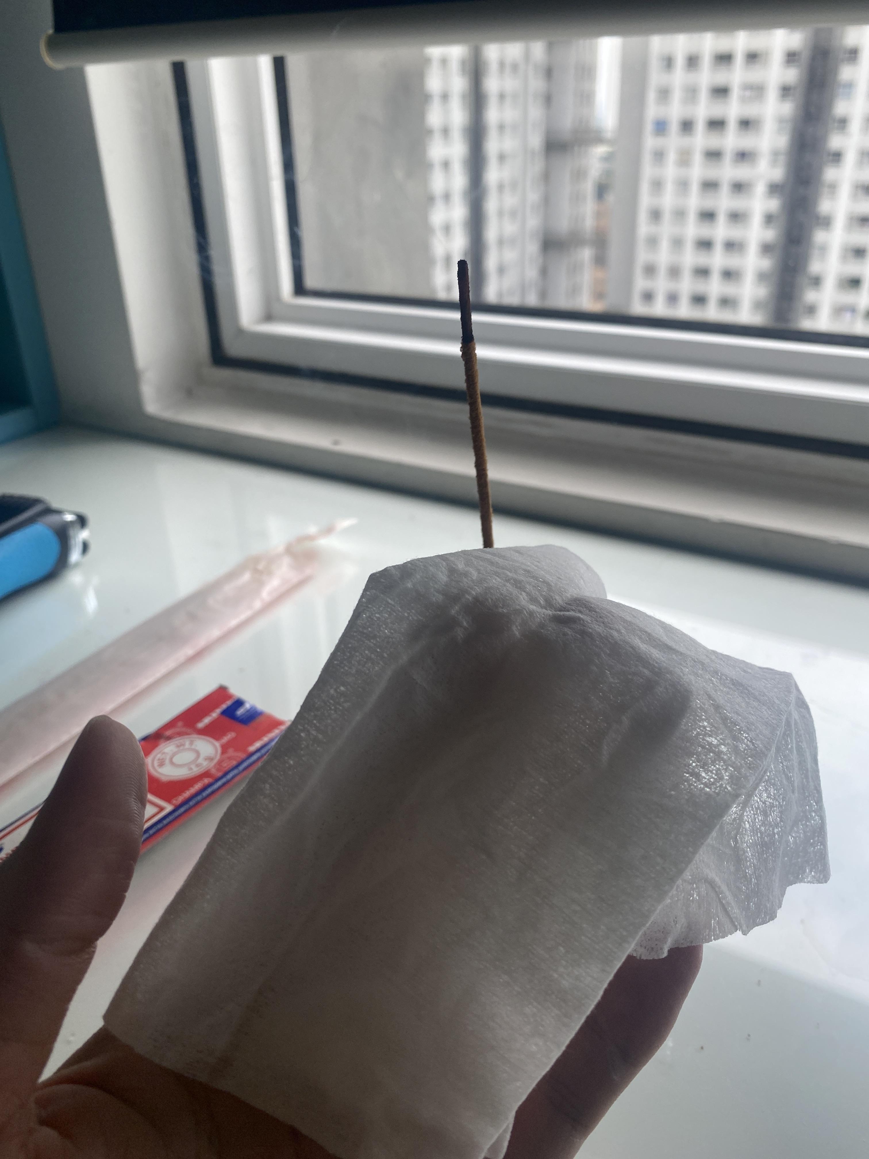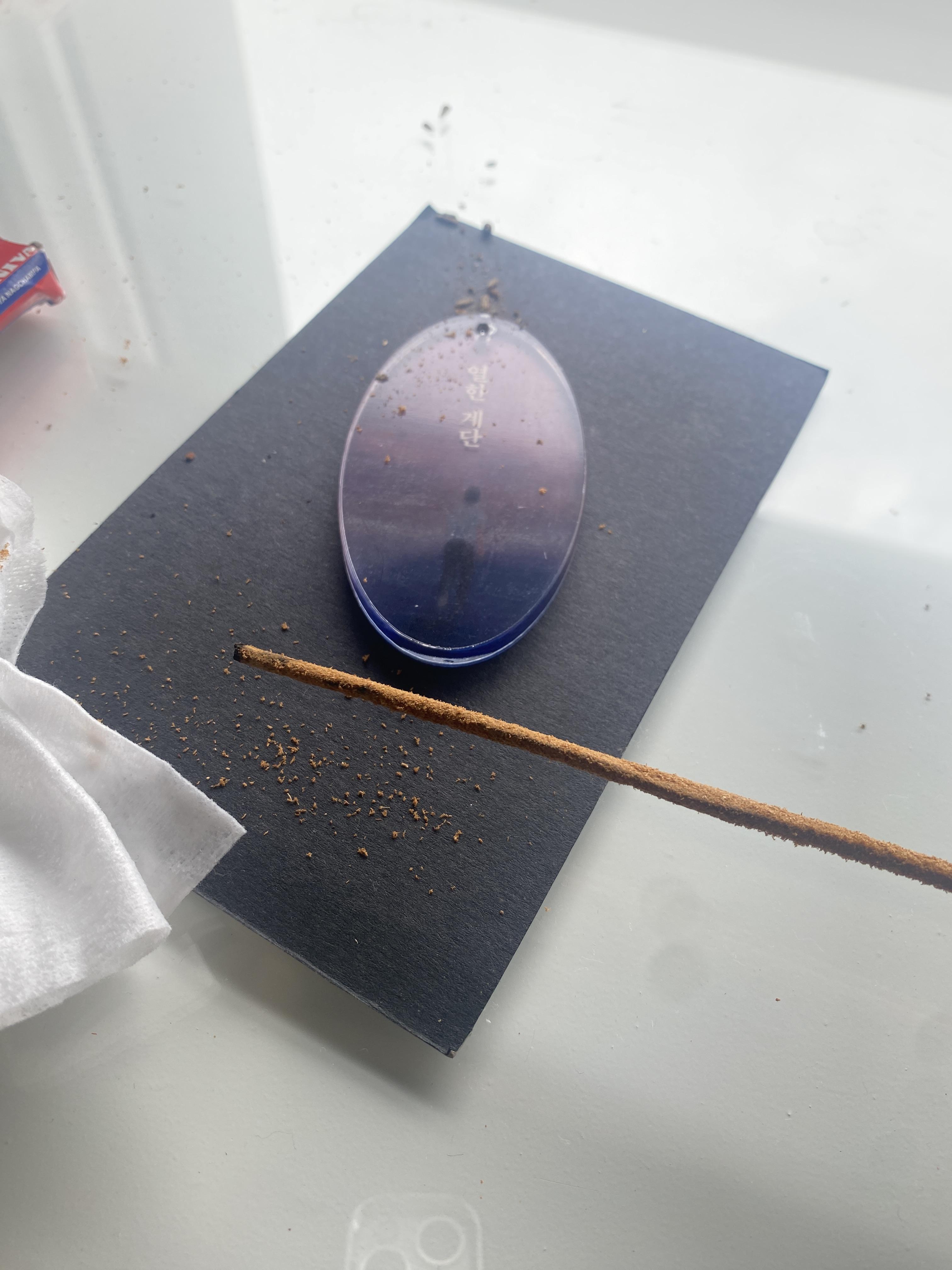 이걸 손으로 대면 분명 뜨거울 텐데 라는 생각이 들어서 일단 살포시 물티슈를 인센스 스틱 위에 올려줍니다