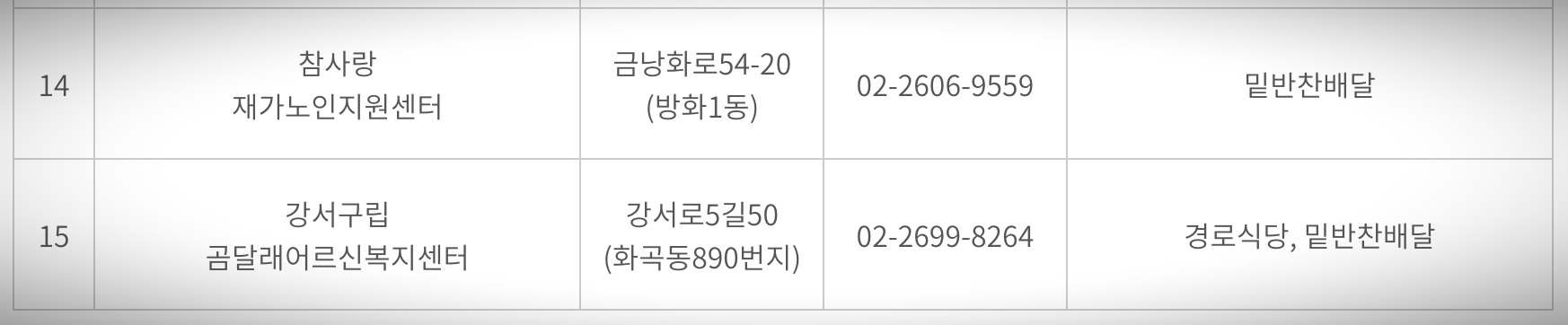 여러 식당과 업체를 통해서 노인 분들에게 식사를 제공해주는데, 식사 배달, 밑반찬 배달 등의 여러 서비스를 제공해줍니다.